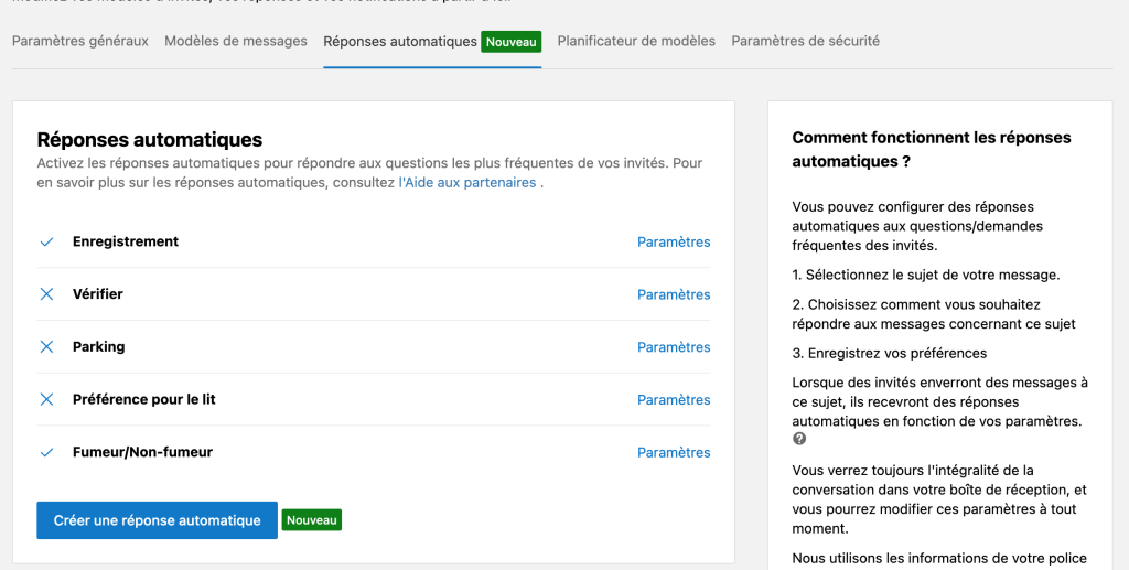 Prenons un exemple concret : un hôtel boutique situé dans une zone historique reçoit régulièrement des questions sur le stationnement, les restaurants à proximité et l’accessibilité pour personnes à mobilité réduite. Avec Auto-Reply, le gestionnaire configure ces trois sujets personnalisés en y ajoutant les informations spécifiques de son établissement. Désormais, chaque fois qu’un voyageur pose une question sur l’un de ces thèmes, il reçoit une réponse instantanée, personnalisée et précise.