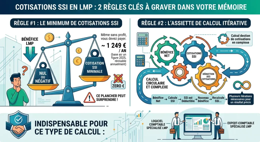 Deux règles à graver dans votre mémoire. D’abord, le minimum de cotisations SSI : même si votre bénéfice LMP est nul ou négatif, vous devez une cotisation minimale d’environ 1 249 €/an (chiffre 2025, révisable annuellement). Ce plancher peut surprendre les propriétaires qui pensaient que déficit = zéro cotisation. Ensuite, l’assiette de calcul itérative : les cotisations SSI sont calculées sur le bénéfice net, et puisqu’elles sont elles-mêmes déductibles, le calcul est circulaire — il faut plusieurs itérations pour obtenir le résultat précis. Un logiciel comptable ou un expert-comptable spécialisé LMP est indispensable pour ce type de calcul.