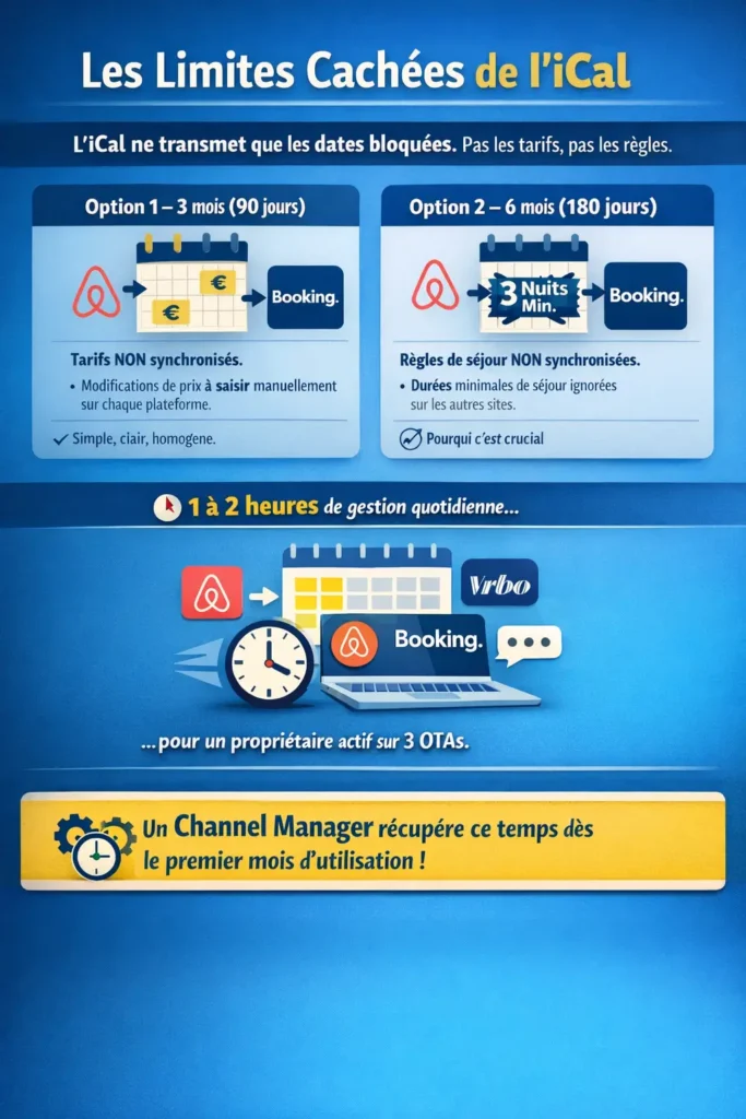 L’iCal ne synchronise que les dates bloquées. Il ne transmet jamais vos tarifs. En pratique, si vous modifiez vos prix sur Airbnb pour une période de forte demande, ces nouveaux tarifs n’apparaîtront pas automatiquement sur Booking.com : vous devrez les saisir manuellement sur chaque plateforme. À 3 plateformes simultanées, c’est une source d’erreurs et d’oublis quasi certaine.