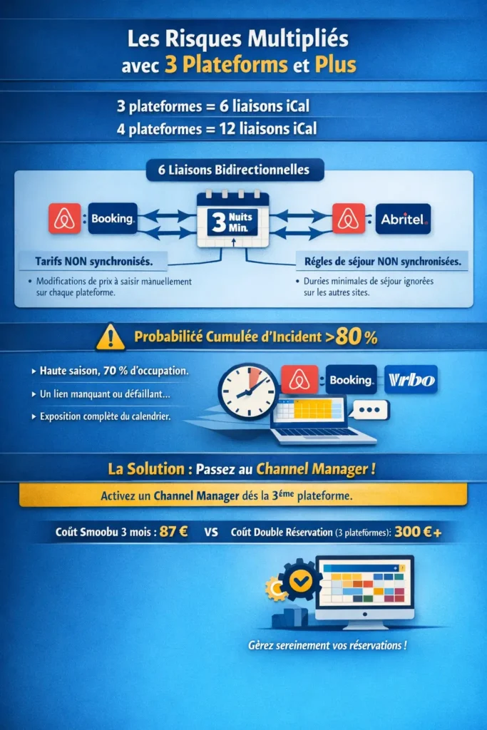 À deux plateformes, la gestion des liens iCal reste gérable manuellement. À trois plateformes (Airbnb + Booking.com + Abritel par exemple), le nombre de liaisons nécessaires monte à 6 liens bidirectionnels. À quatre plateformes, c’est 12 liaisons. Cette complexité croissante multiplie les risques de défaillance et dépasse les capacités d’un suivi manuel raisonnable.