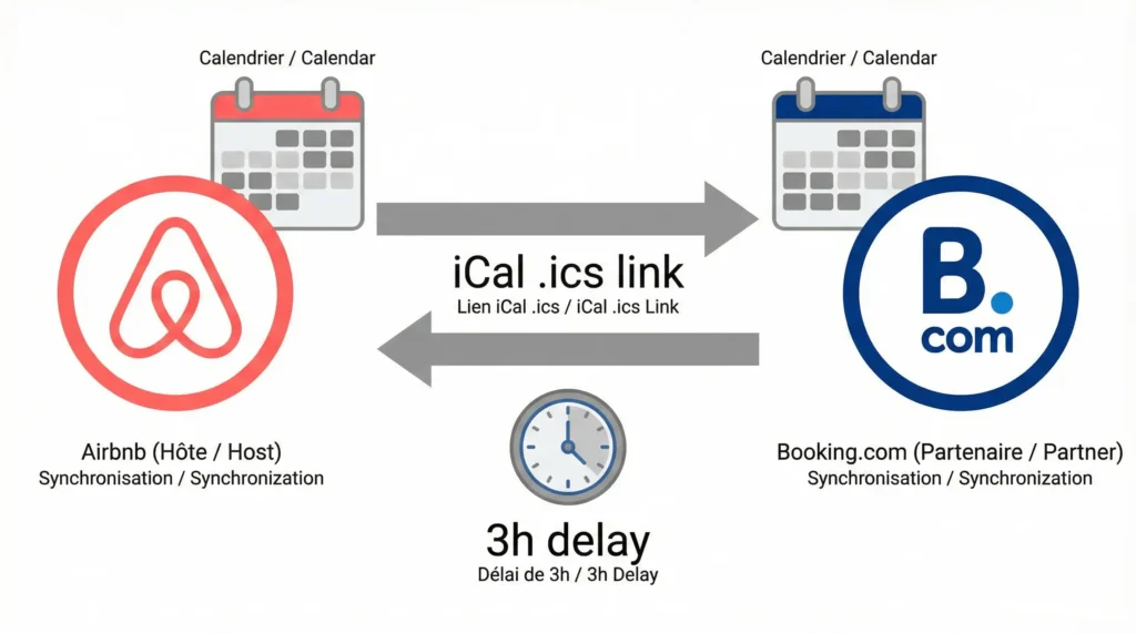 Le format iCal (iCalendar) est un standard universel créé en 1998, encore utilisé par toutes les grandes plateformes en 2026. Airbnb génère une URL unique pour chaque annonce, qui se termine en .ics. Cette URL pointe vers un fichier mis à jour automatiquement à chaque nouvelle réservation. Vous collez cette URL dans l’interface de Booking.com, qui vient “lire” votre calendrier Airbnb toutes les 30 minutes à 3 heures. La limite principale : ce délai de mise à jour crée une fenêtre de vulnérabilité. La méthode est gratuite et prend 10 minutes à configurer, mais ne protège pas les propriétaires à fort taux d’occupation contre 100 % des doubles réservations.